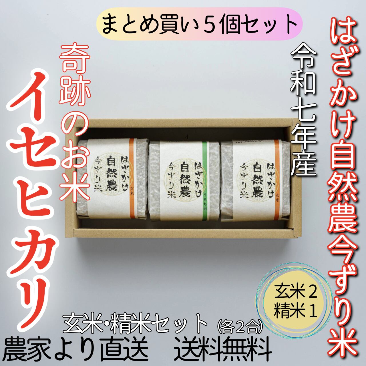 #【5個セット】奇跡のお米イセヒカリ はざかけ自然農今ずり米 玄米×2・精米(五分)×1(各2合)(送料無料)