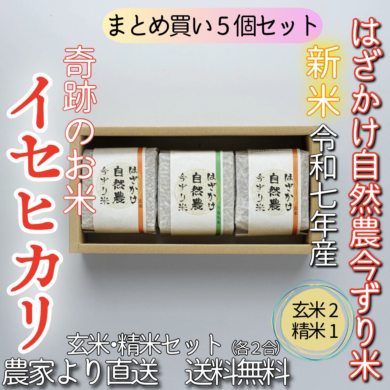 #【まとめ買い5個セット】奇跡のお米イセヒカリ はざかけ自然農今ずり米 玄米×2・精米(五分)×1(各2合)(送料無料)