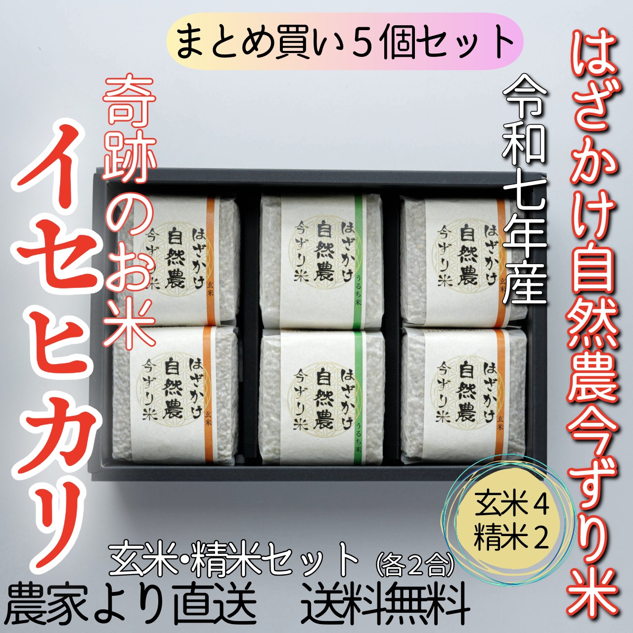 【5個セット】奇跡のお米「イセヒカリ」 はざかけ自然農今ずり米 玄米×4 精米×2個(各2合)(送料無料)