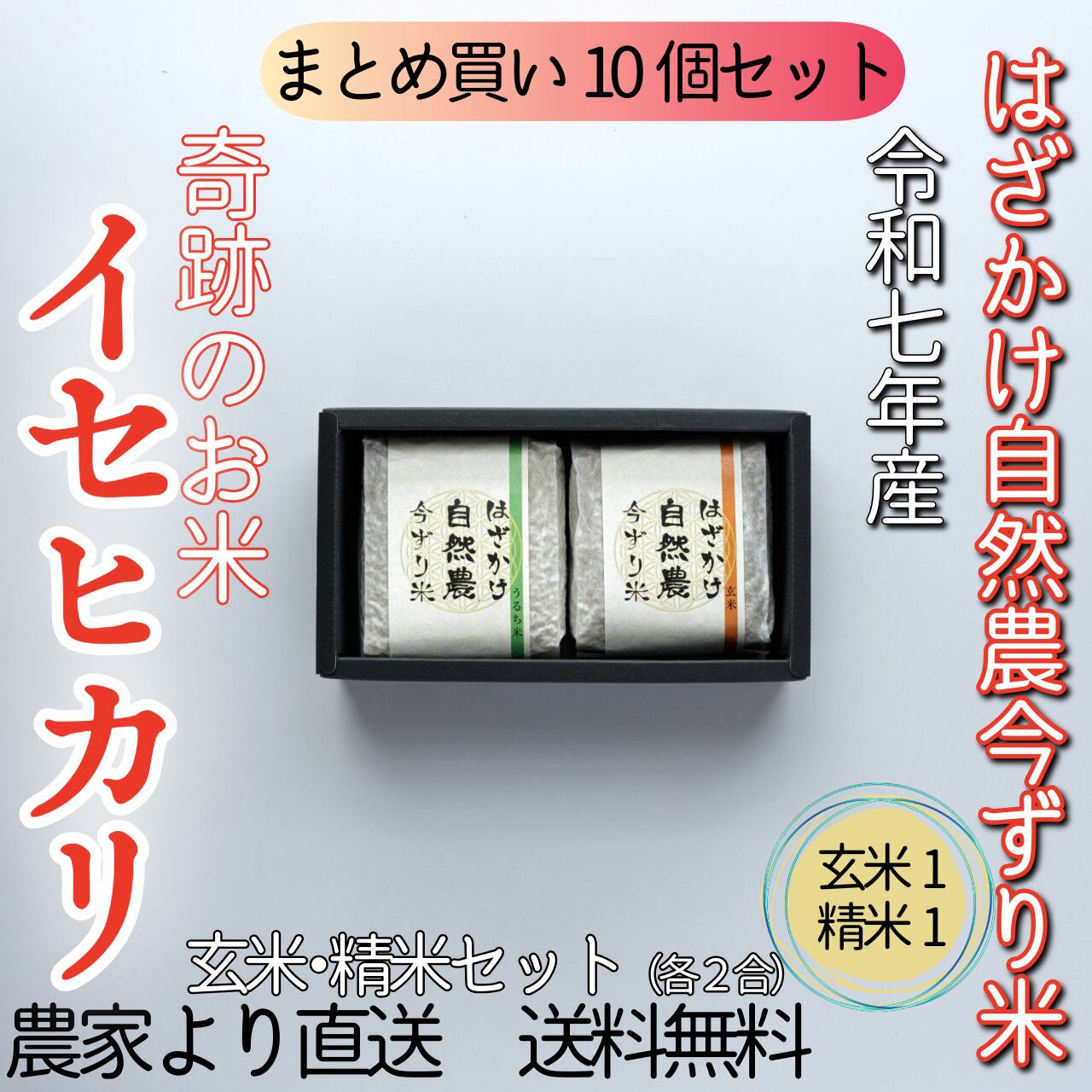 【10個セット】奇跡のお米「イセヒカリ」 はざかけ自然農今ずり米 玄米×1・精米×1(各2合)(送料無料)