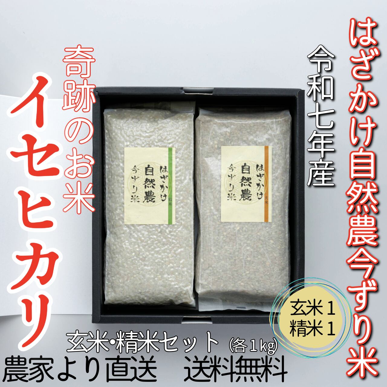 #奇跡のお米イセヒカリ はざかけ自然農今ずり米 玄米×1・精米×1(各1kg)(送料無料)