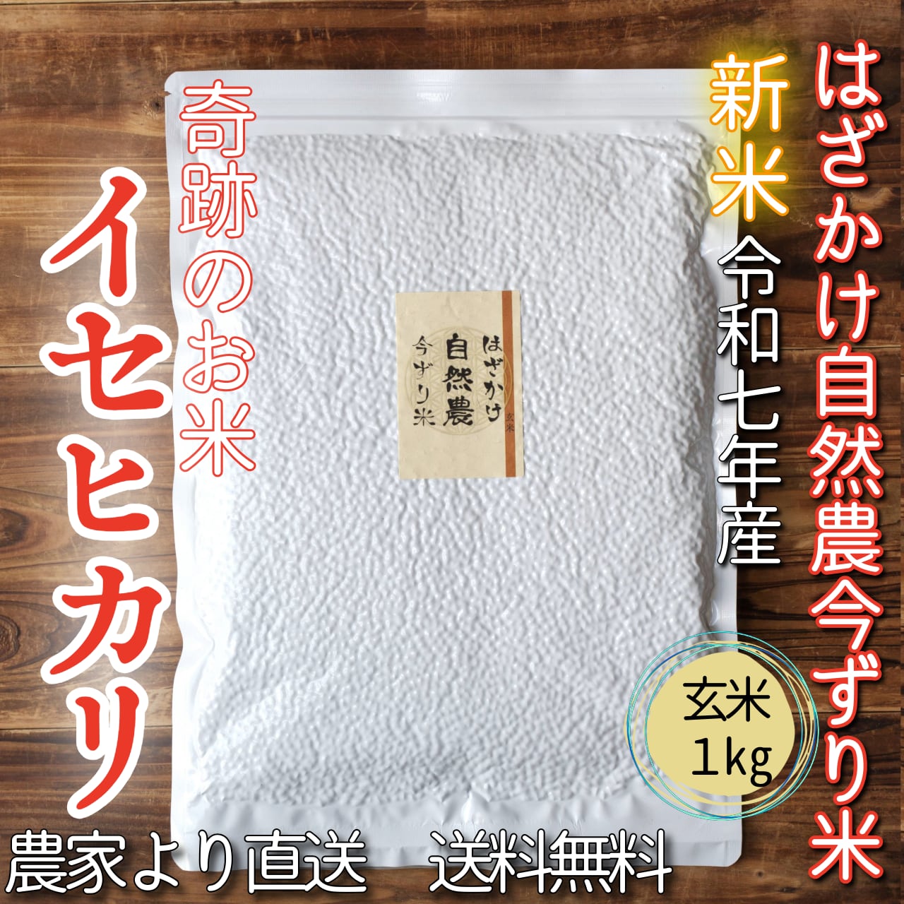 #奇跡のお米イセヒカリ はざかけ自然農今ずり米 玄米1kg(送料無料)